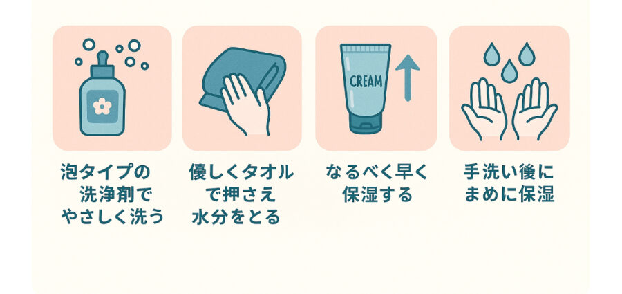 - 体を拭く際は、こすらず優しくタオルで押さえて水分をとる。