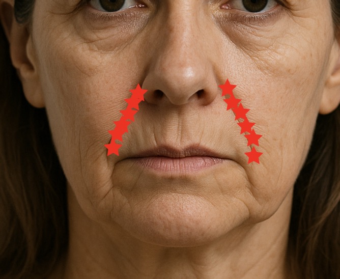 → 頬の支え(リガメント周囲)を補強する注入が最も効果的です。