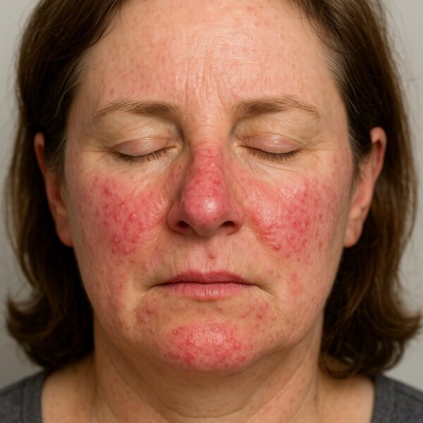 「酒さ(rosacea)」とは、顔面特に頬・鼻・額・あごといった部位に持続的な紅斑(赤み)や毛細血管拡張、小さな丘疹・膿疱を伴う慢性炎症性皮膚疾患です。また、時に眼部(「眼型酒さ」)や鼻部の肥厚(いわゆる「酒渣鼻」)を伴うこともあります。